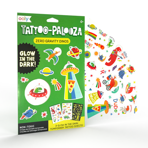 Blast off into fun with the Tattoo-Palooza Glow in the Dark Temporary Tattoos - Zero Gravity Dinos! This set of 3 tattoo sheets features temporary tattoos combining dinosaurs and space adventures that glow in the dark for an out-of-this-world experience. From astronaut T-Rexes to floating triceratops, these kids' temporary tattoos add a prehistoric twist to cosmic fun.