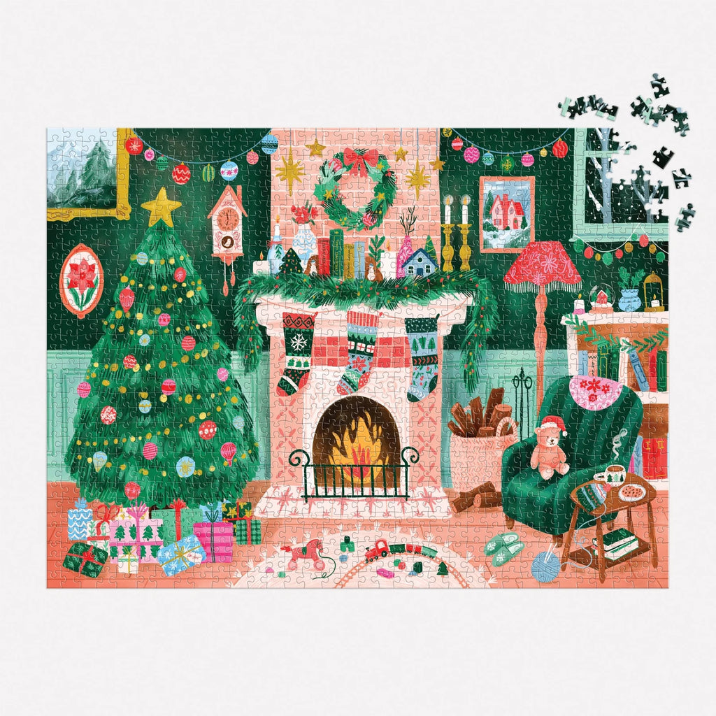 1000 PIECE PUZZLE - Cozy By The Fireplace 1000 Piece Puzzle by Galison features a cozy living room setting, perfectly decorated for the holiday season. This puzzle is just the right level of challenge for the whole family to join in on for hours of puzzling fun! The box includes an insert with the full puzzle image for reference.
