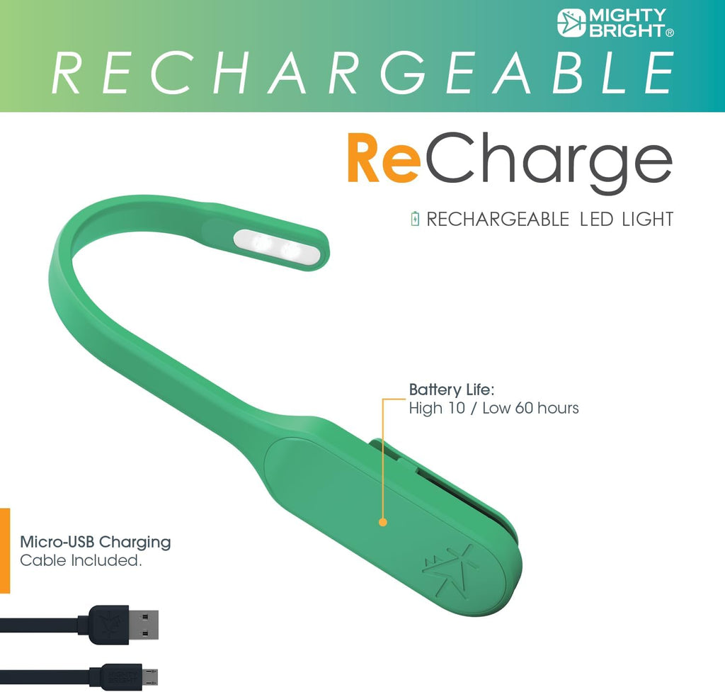 - The ReCharge Booklight is the perfect all-purpose booklight, providing 2-10 lumens of adjustable brightness with a battery life of up to 60 hours at its lowest setting. Fully charged within 1 hour, with micro USB charging cable included (also compatible with any standard micro USB cable).