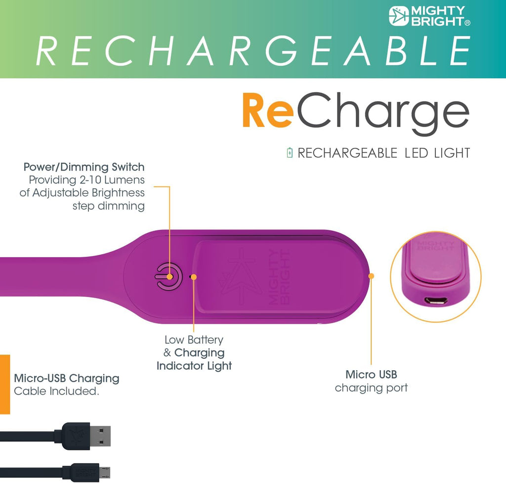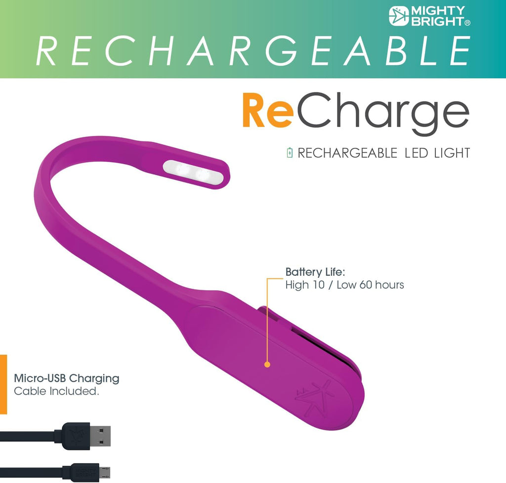 • The ReCharge Booklight is the perfect all-purpose booklight, providing 2-10 lumens of adjustable brightness with a battery life of up to 60 hours at its lowest setting. Fully charged within 1 hour, with micro USB charging cable included (also compatible with any standard micro USB cable).