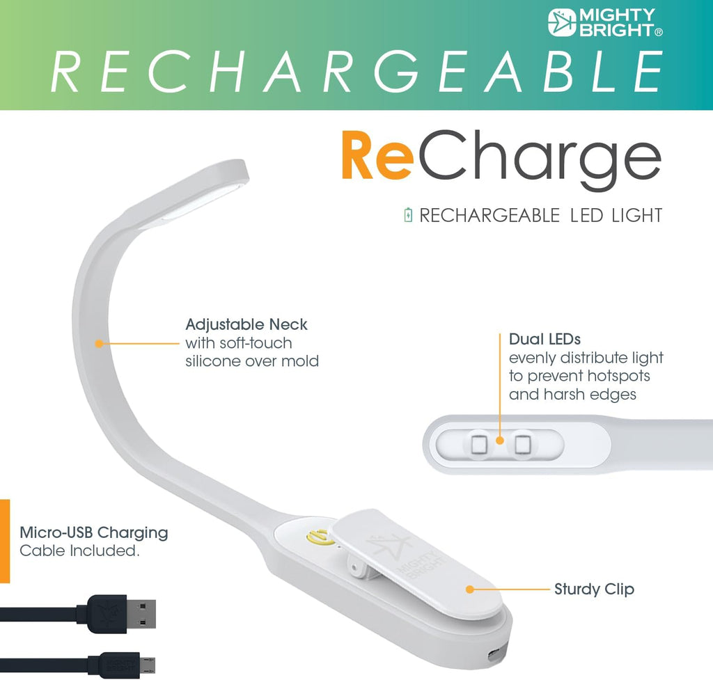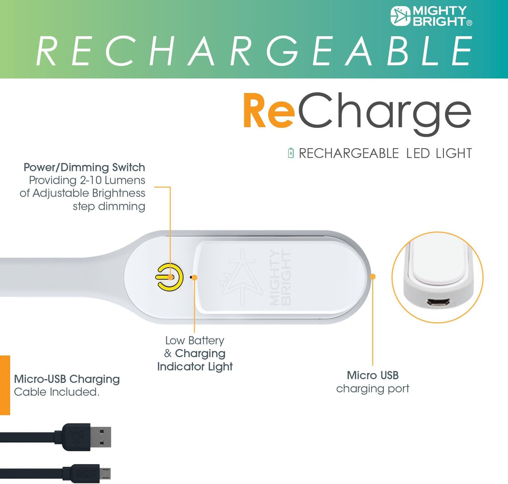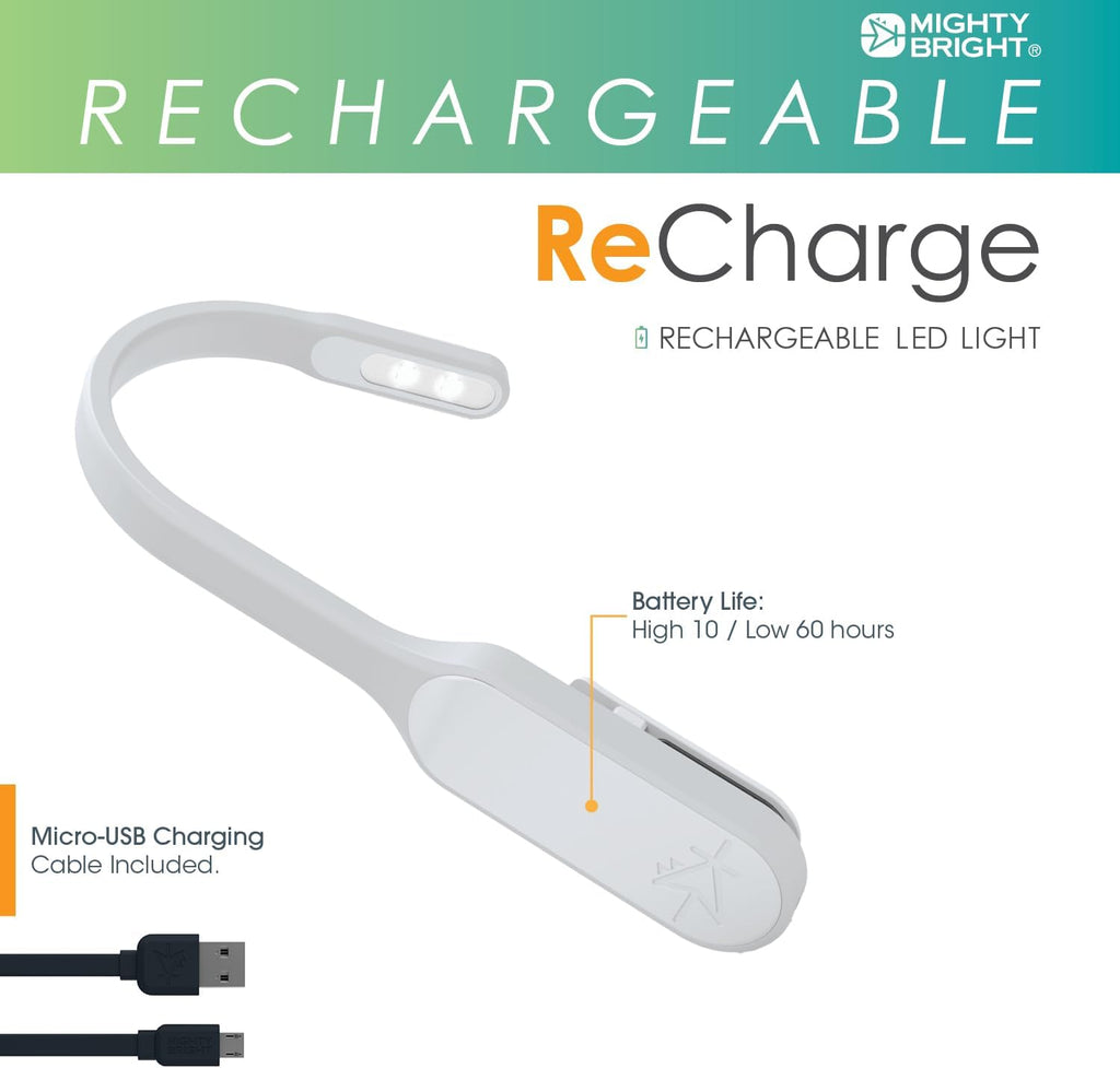 • The ReCharge Booklight is the perfect all-purpose booklight, providing 2-10 lumens of adjustable brightness with a battery life of up to 60 hours at its lowest setting. Fully charged within 1 hour, with micro USB charging cable included (also compatible with any standard micro USB cable).