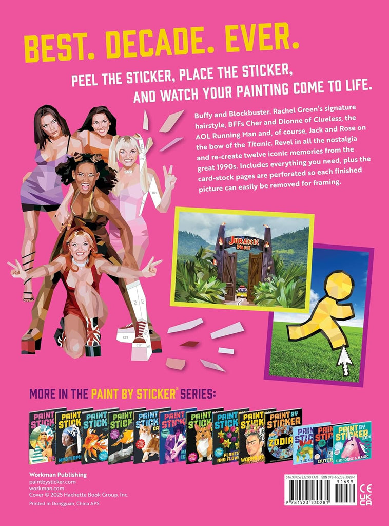 The bestselling Paint by Sticker series takes on the best decade: the 1990s! The '90s are back, baby! Here's a sticker-able ode to all the iconic and nostalgic gems of this amazing time period: a Blockbuster VHS tape, Michael Jordan scoring the game-winning shot, a pair of Beanie Babies, AOL's Running Man, Rachel Green's hairstyle, the "flying" scene in Titanic, and more. Plus the card-stock pages are perforated, so every finished piece can be easily removed for gifting or display.